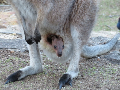 Our local friendly wallaby, Mos, is here each day. We can hardly deny her some grain under these conditions, especially with a little pink joey on board.